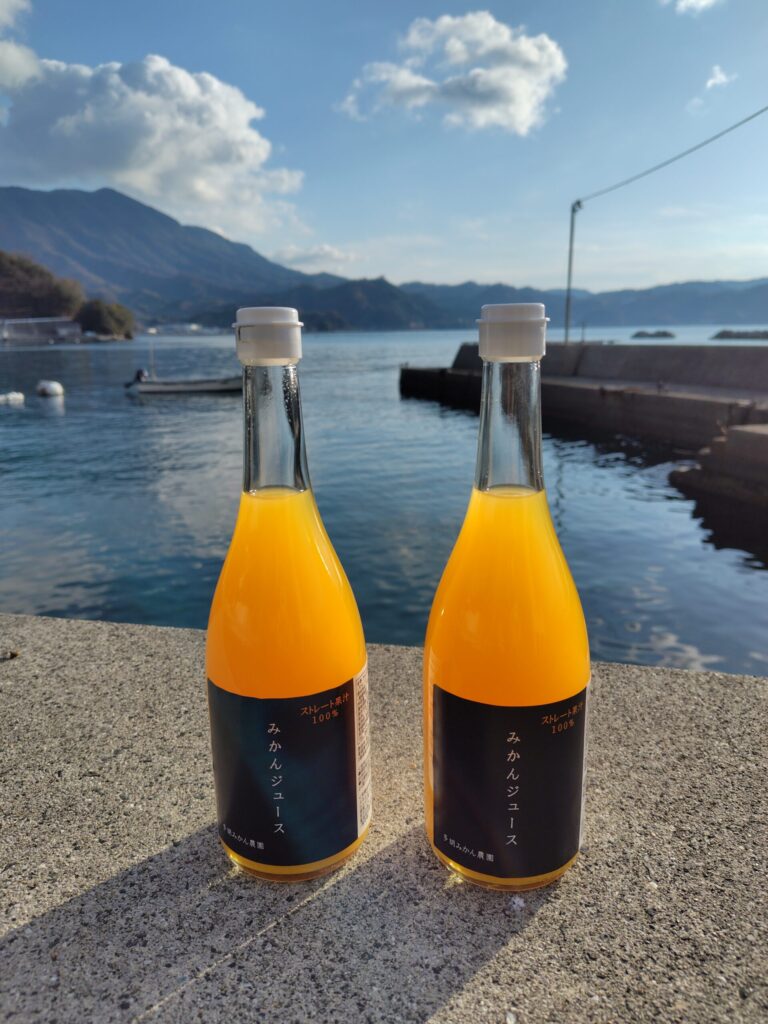この時期にピッタリ。汗をかいた後に最適。当園のミカンジュース、飲んでみてください。