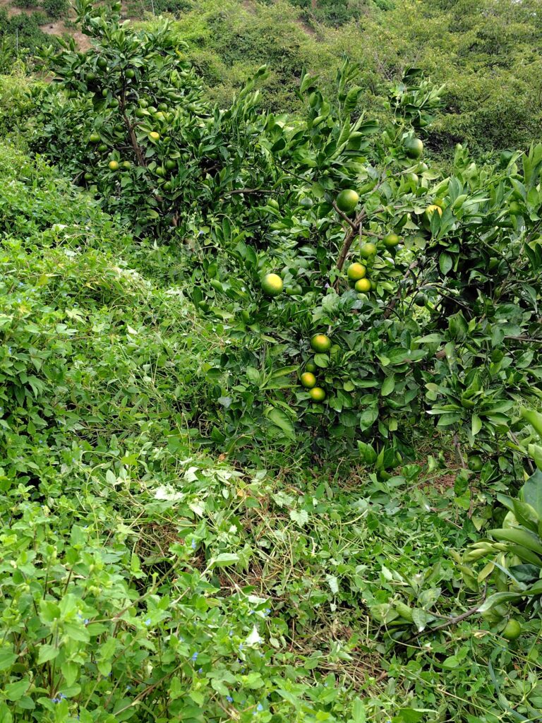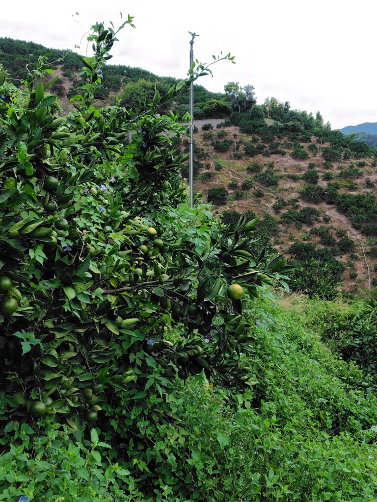 今年から草生栽培を試みていますが、まだ実験段階です。ただ、一巡して最初の園地に戻った時には草がすごいことになっていました😿
