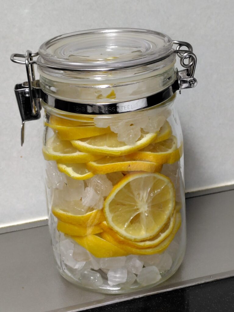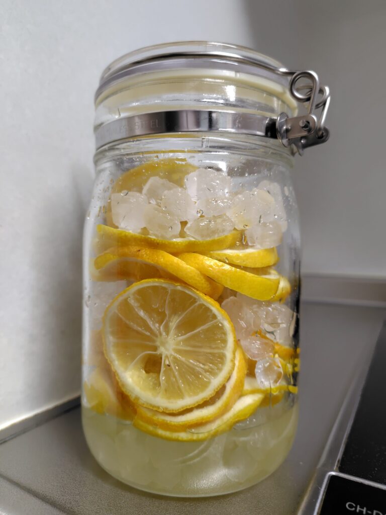 今年も当園のレモンを使ってレモンシロップを作ってみました。レモン4個と氷砂糖340グラムを交互に入れてみました。正直、分量はお好みです。