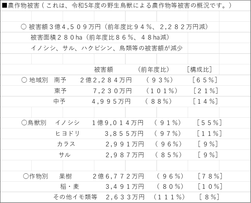 このデータによると、令和5年度は前年よりも鳥獣被害が少なくなっています。ですが、私の体感では毎年毎年被害は増大しているように思います。